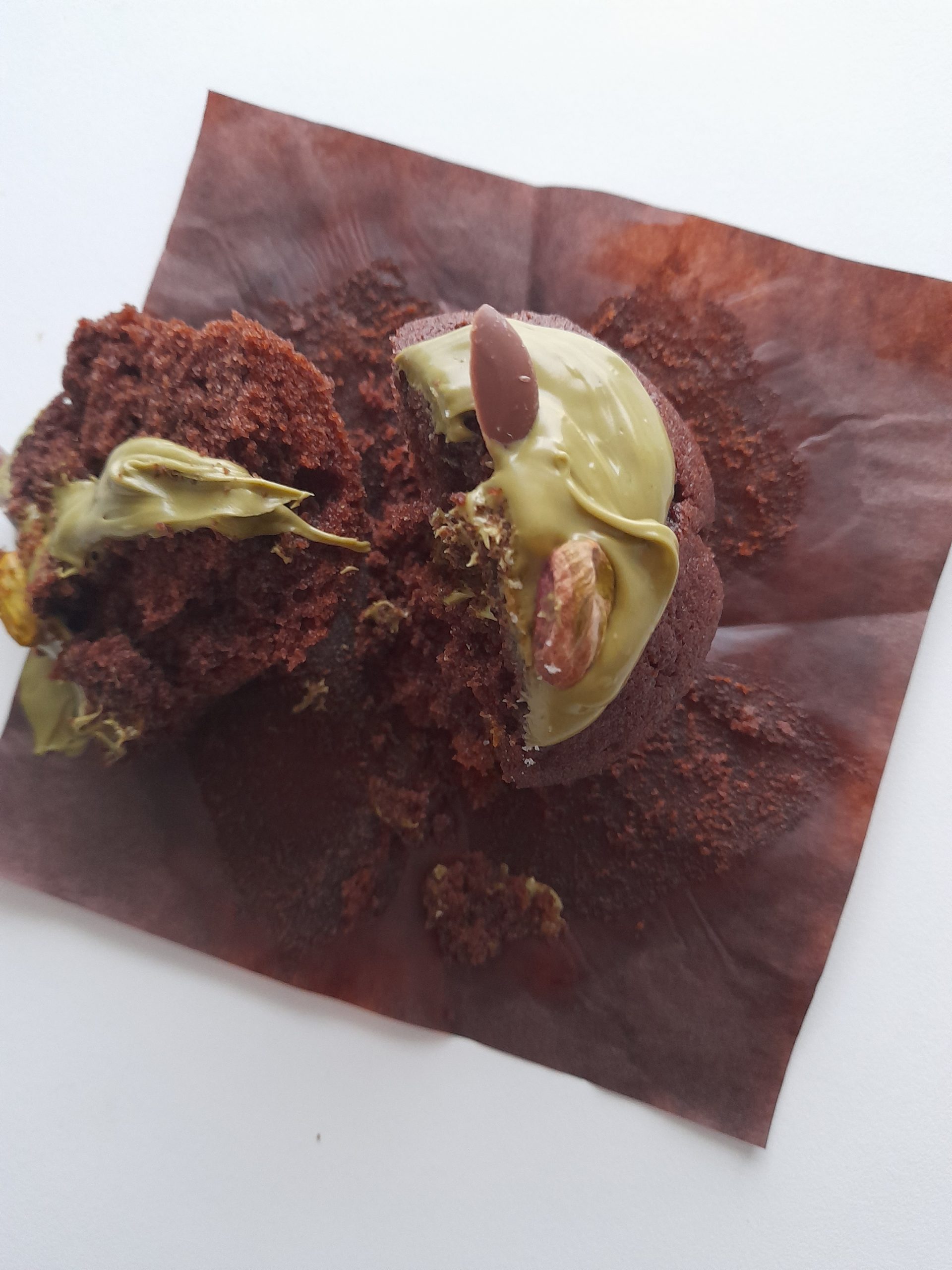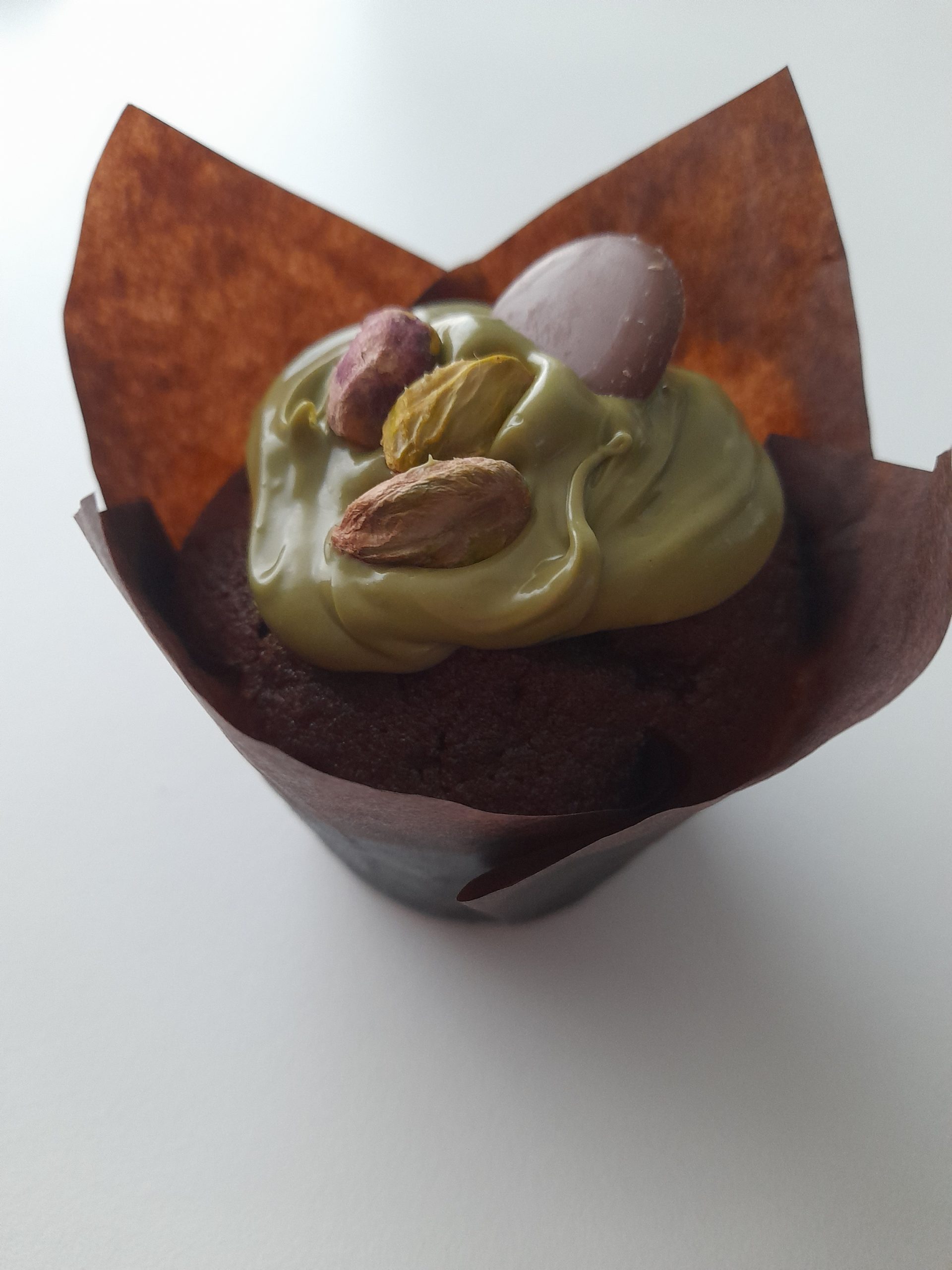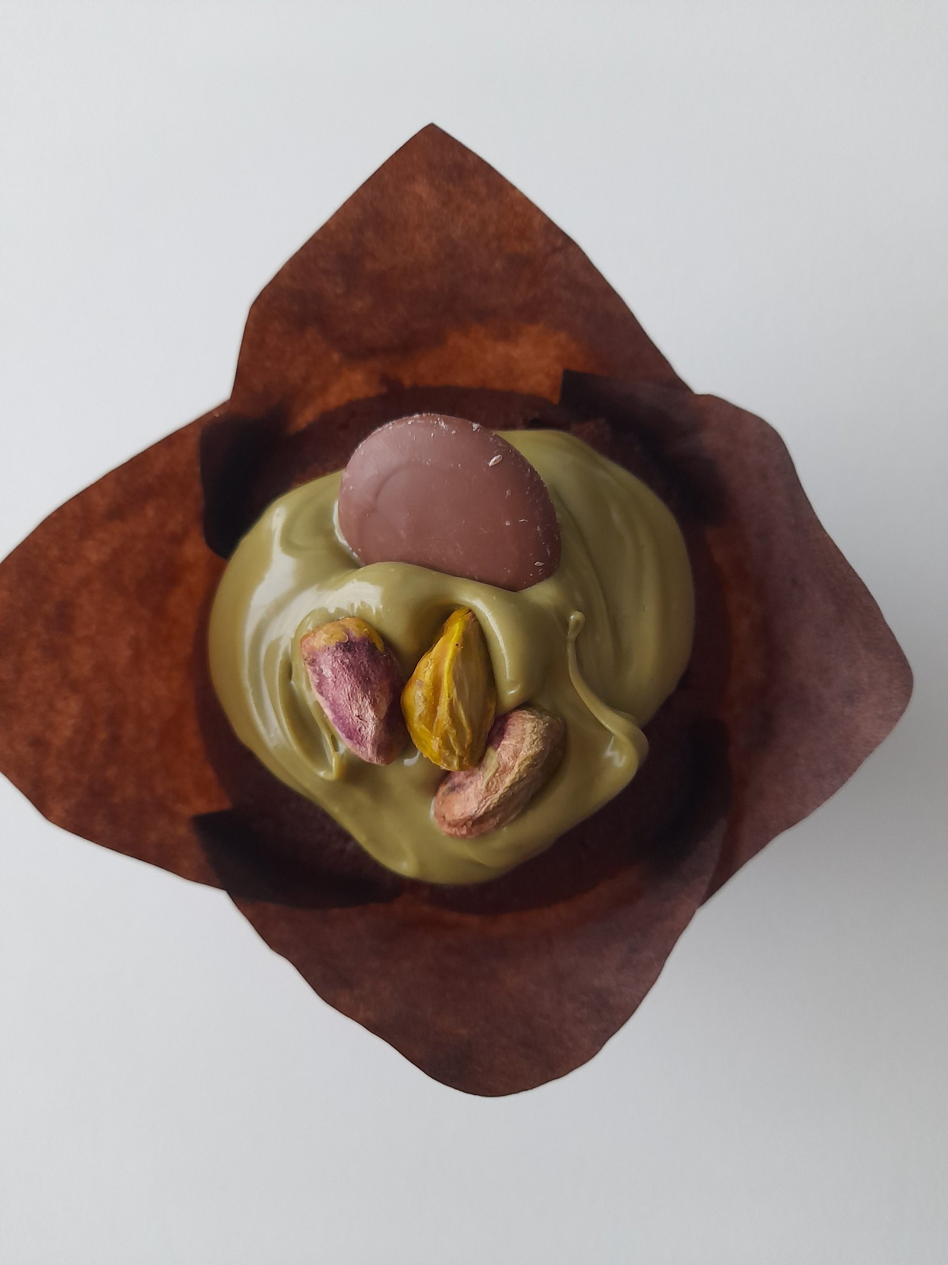 The centre of each muffin is filled with a premium pistachio cream, chosen for its smooth texture and strong pistachio flavour. On top, we add more of this creamy pistachio spread along with selected pistachios for extra crunch. To finish, we decorate every muffin with Belgian white chocolate from Callebaut, a chocolate known for its quality, purity, and silky finish.